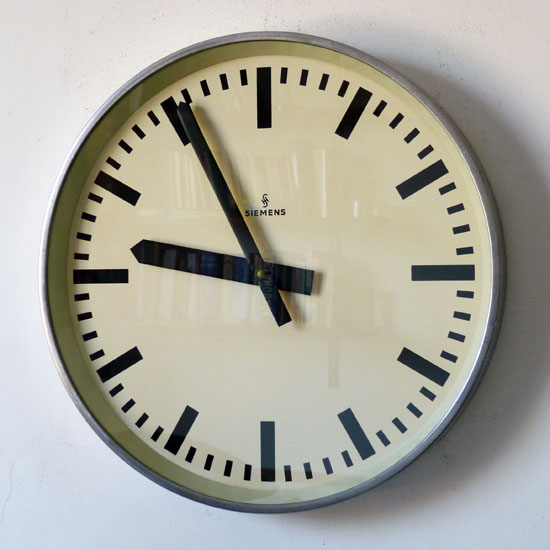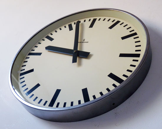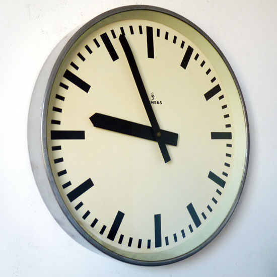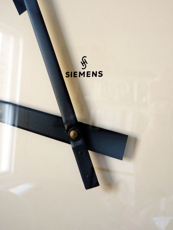 This impressive large steel clock from the late 1960's or early 1970's was manufactured by Siemens. It has a very contemporary minimalist slimline form with broad hands. Many German industrial clock designs are based upon the iconic Swiss Federal Railways clocks of the 1940's designed by Hans Hilfiker (1901-93), now re-issued by Mondaine, featuring a simple pared down but graphically strong clock face, influenced by the teachings at the Bauhaus.