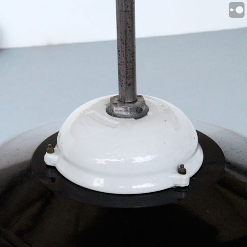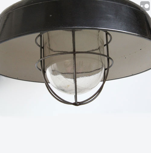 These are rare industrial ceiling lights from Communist East Germany. The hoods are made of bakelite. The lamp and glass holder on top is ceramic as is the bulb holder. The glass dome screws into the ceramic. The glass is very thick and crudely manufactured which gives a very nice rippled effect to the emitted light. The condition overall is very good, with a perfect amount of weathering. A couple of chips in the ceramic where the steel cage bolts fits, but nothing unexpected or detrimental. Normal size screw fit bulb. The lamp is sold with 50cm high quality stainless steel chain, modern black textile wiring.