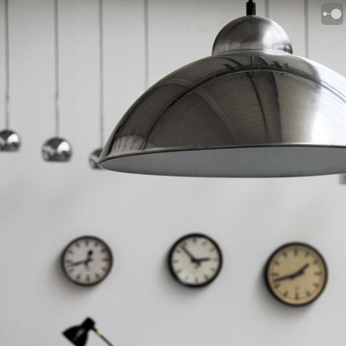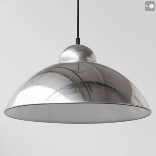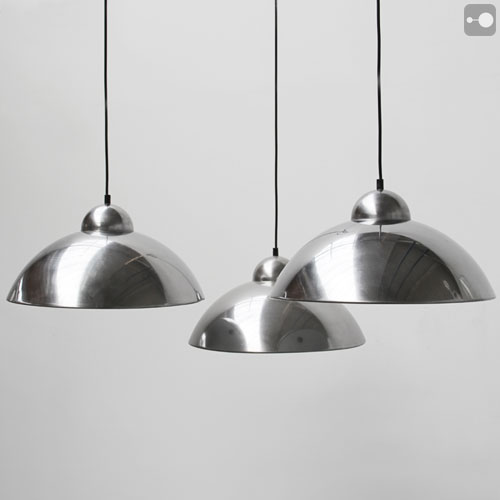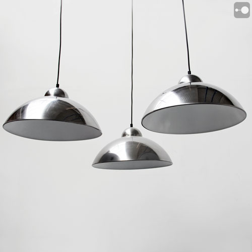 A set of 3 large UFO style English retro lamp shades from the 1960s; possibly industrial kitchen lights They are made from polished steel, with white painted interiors. No dents or major scratches; a micro amount of tarnishing.