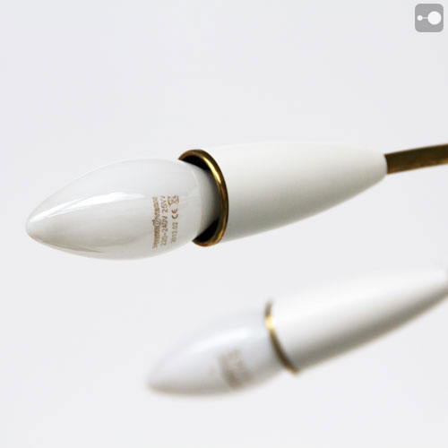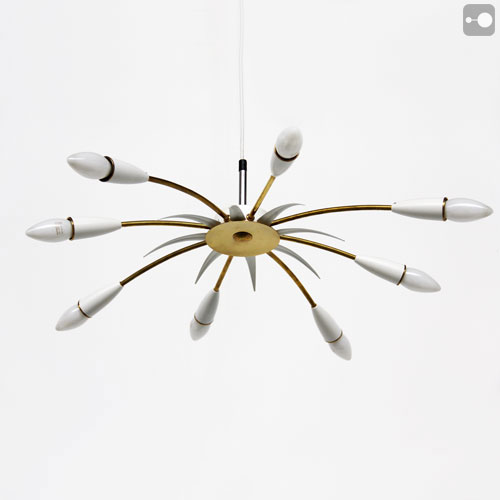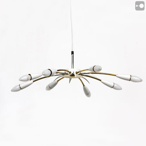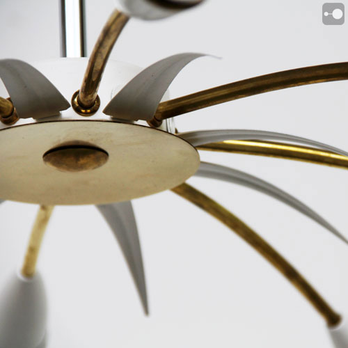 A very striking vintage 1950's ceiling lamp probably from Italy. The arms are brass and the cups are white painted bakelite. It can be suspended as shown in the pictures or flush mounted. Refurbished.